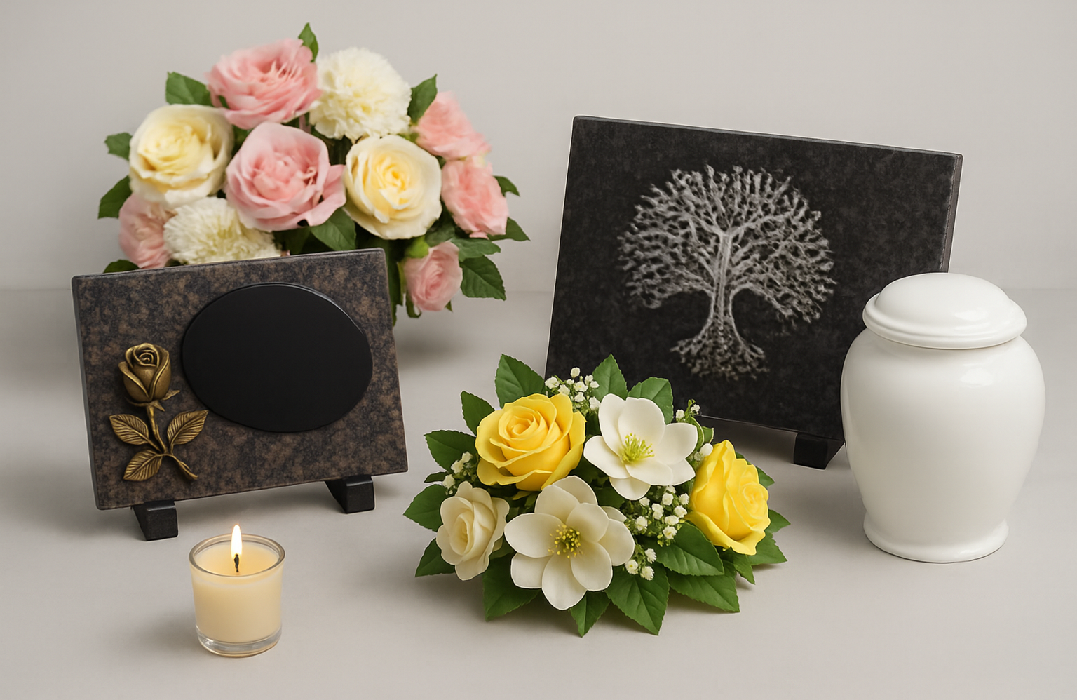 En plus de nos plaques funéraires et de nos fleurs artificielles, Pompes Funèbres Memorys vous proposent en magasin de nombreux articles funéraires supplémentaires pour rendre hommage à vos proches de manière personnelle.
